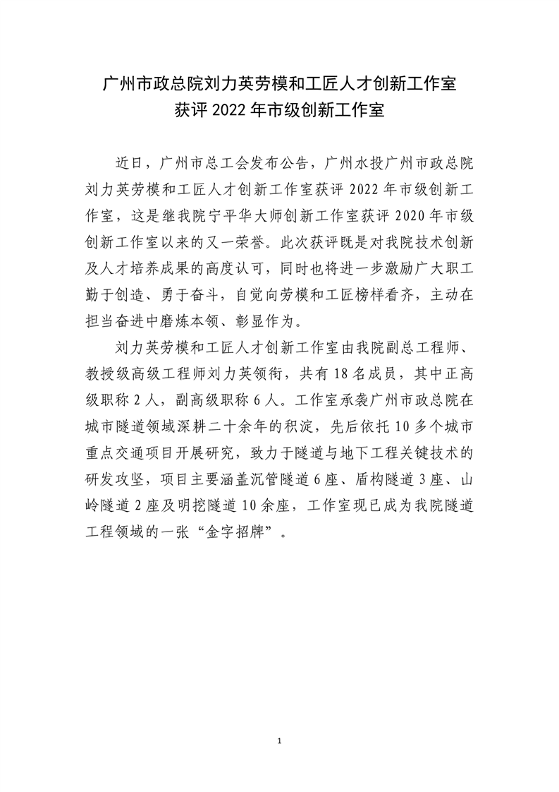广州市政总院刘力英劳模和工匠人才创新工作室获评2022年市级创新工作室