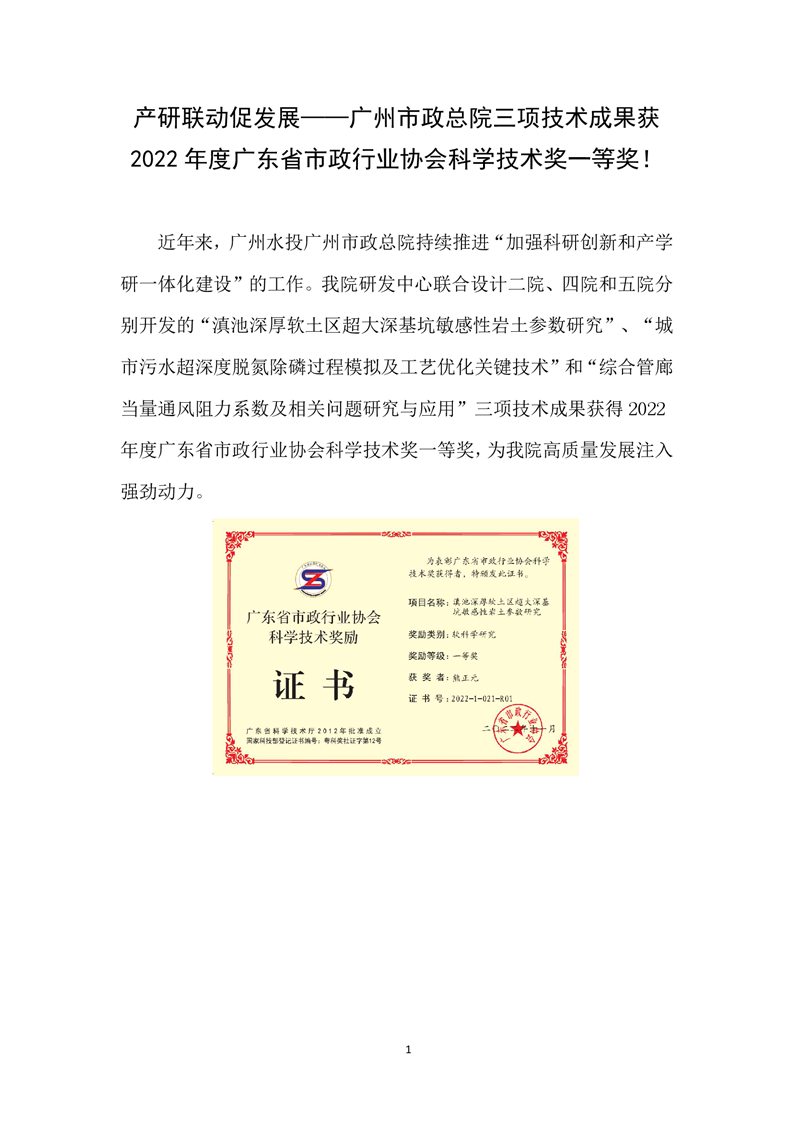 产研联动促发展——广州市政总院三项技术成果获2022年度广东省市政行业协会科学技术奖一等奖!