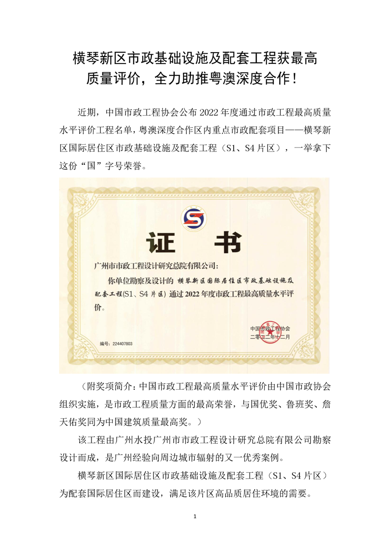 横琴新区市政基础设施及配套工程获最高质量评价,全力助推粤澳深度合作!