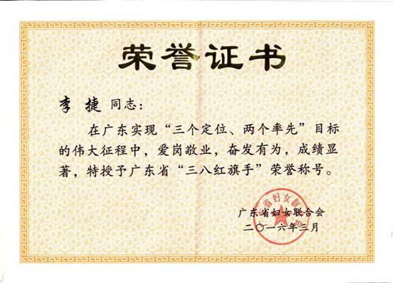 热烈祝贺我院研发中心总工李捷被授予“广东省三八红旗手”荣誉称号
