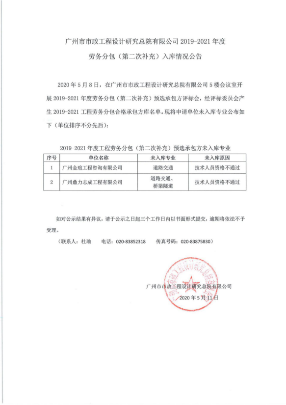 2019-2021年度劳务分包(第二次补录)入库情况公告