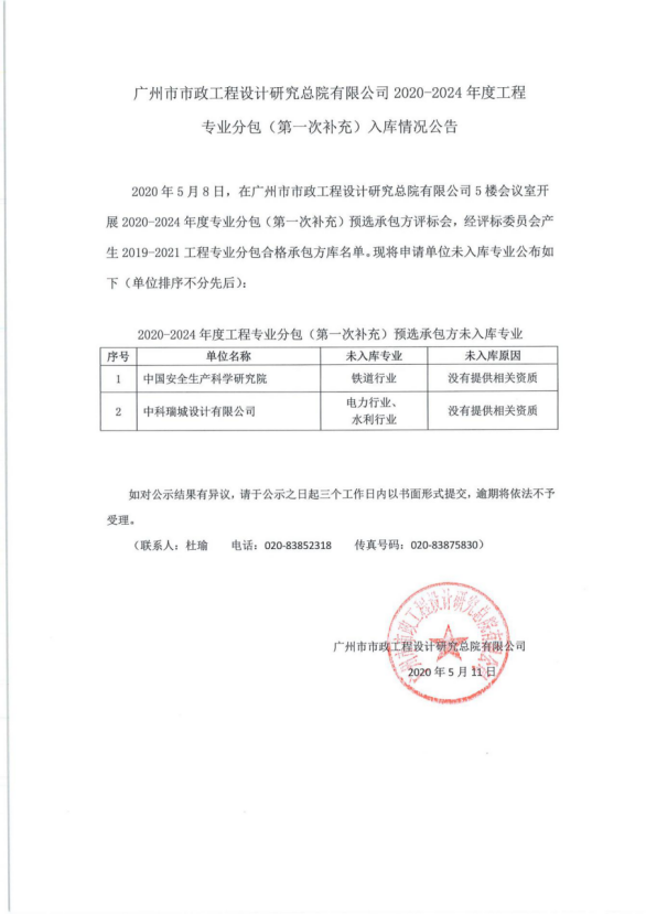 2020-2024年度专业分包(第一次补录)入库情况公告