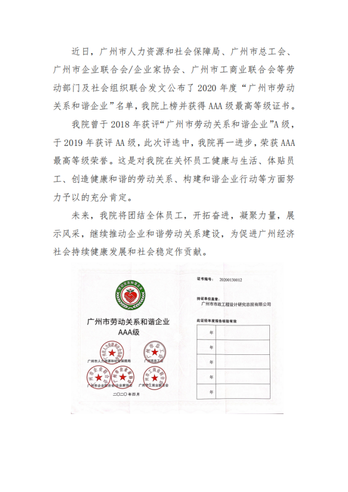 我院喜获“广州市劳动关系和谐企业AAA级”称号