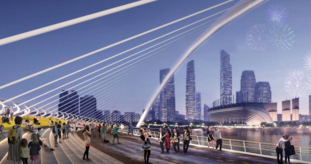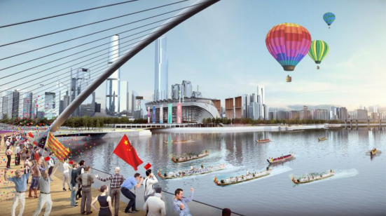 “琴鸣绢舞 · 岭南花舟”是粤曲中的水袖、是羊城花舟,也是岭南古琴,海心沙人行桥的造型概念即来自于此。