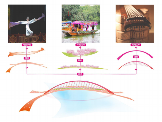 桥型设计吸取粤曲水袖、广州水上花市、岭南古琴等具有岭南文化代表性的意象