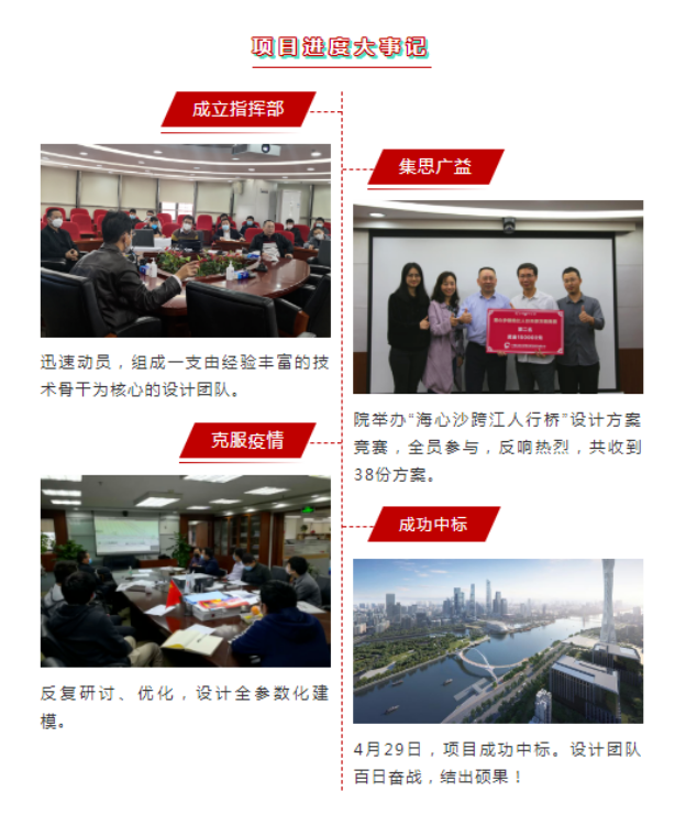 海心沙人行桥对于广州的城市建设发展意义重大。接到初步设计委托后,广州市政总院迅速成立专门的项目指挥部,熊正元董事长亲自动员,杨勇副总经理担任项目指挥长、设计一院童恺旻院长担任副指挥长,宁平华总工程师担任项目技术总负责人,设计一院总工乐小刚担任技术副负责人。各专业紧急动员、积极配合,成立了一支技术经验丰富、能打硬仗的设计团队。