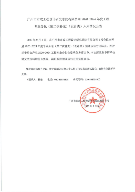 2020-2024年度工程专业分包(第二次补充)(设计类)入库情况公告