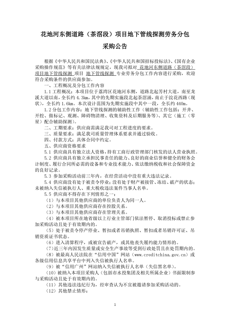 采购公告发布-花地河东侧道路(茶滘段)项目地下管线探测劳务分包