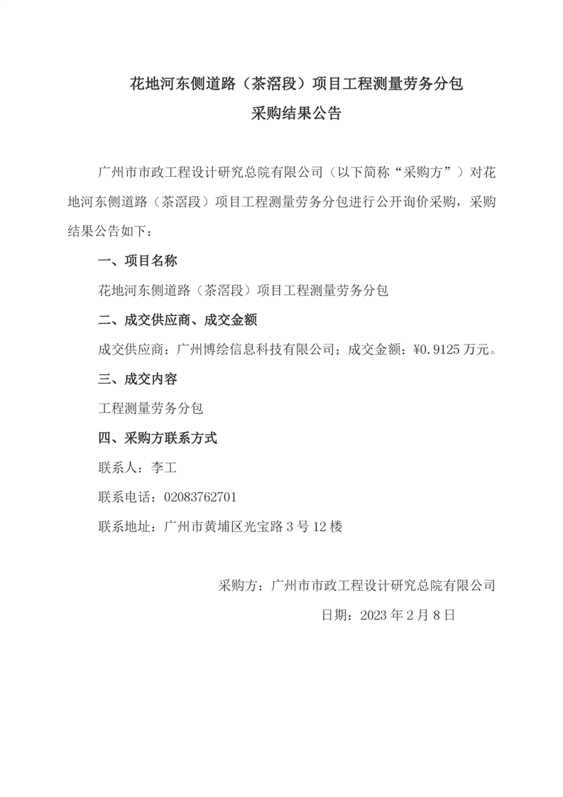 采购结果公告-花地河东侧道路(茶滘段)项目工程测量劳务分包