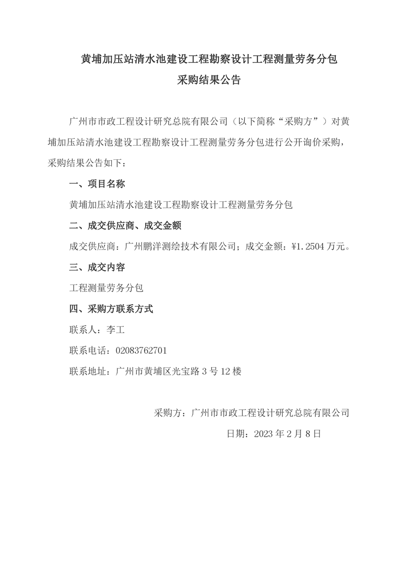 采购结果公告-黄埔加压站清水池建设工程勘察设计工程测量劳务分包