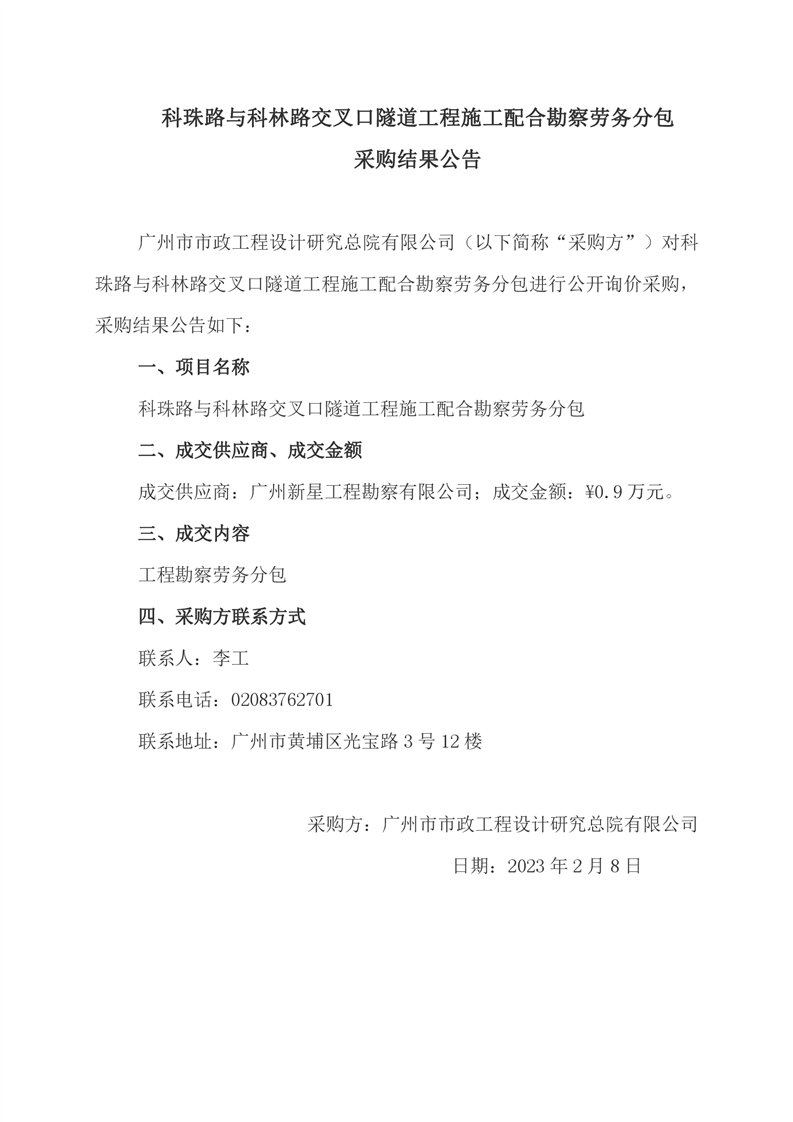 采购结果公告-科珠路与科林路交叉口隧道工程施工配合勘察劳务分包