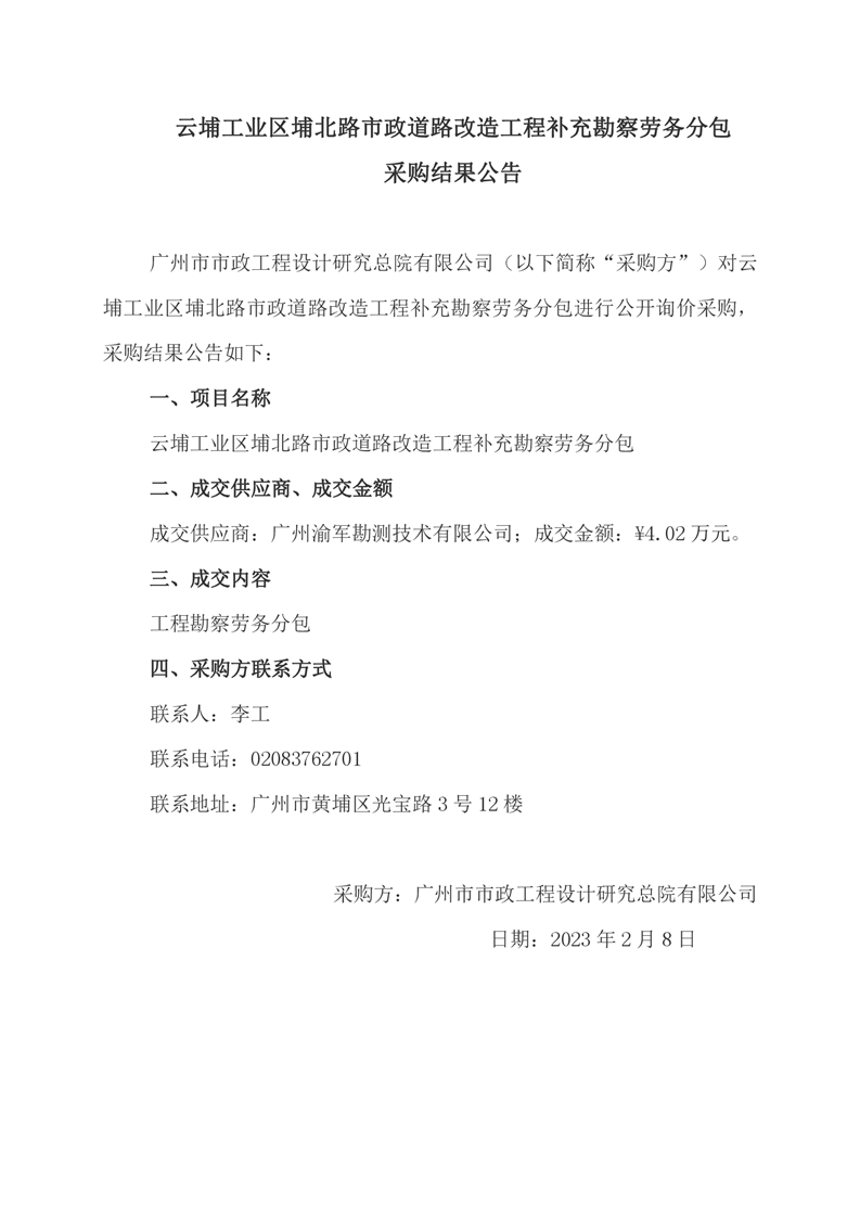 采购结果公告-云埔工业区埔北路市政道路改造工程补充勘察劳务分包
