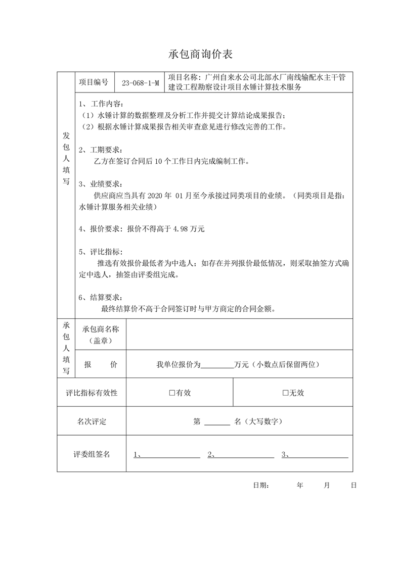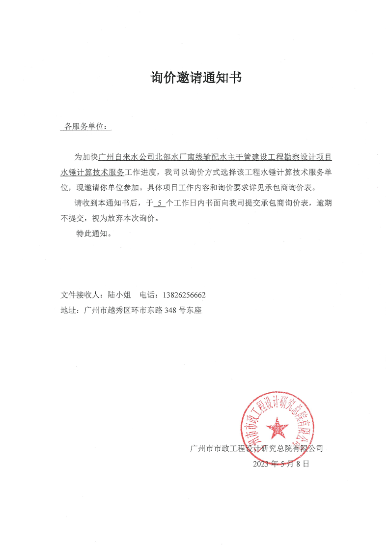 广州自来水公司北部水厂南线输配水主干管建设工程勘察设计项目水锤计算技术服务采购
