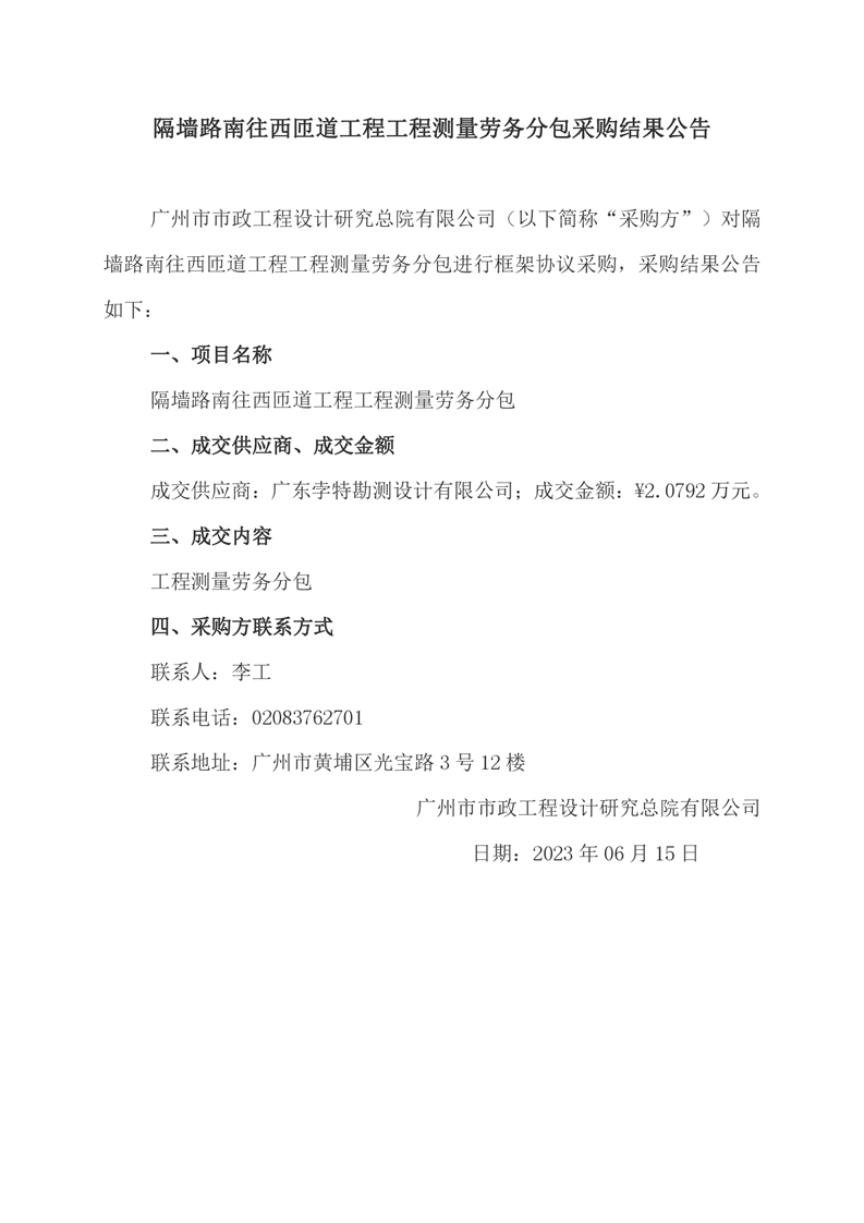 隔墙路南往西匝道工程工程测量劳务分包采购结果公告