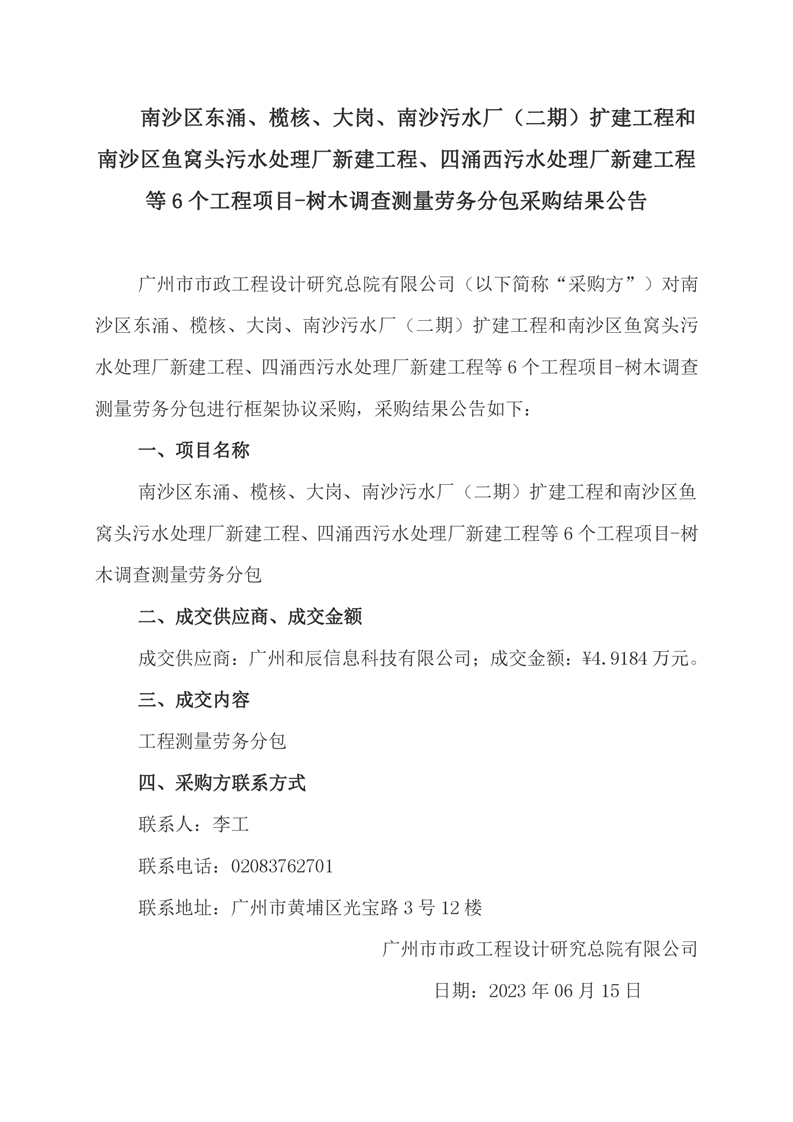 南沙区东涌、榄核、大岗、南沙污水厂(二期)扩建工程和南沙区鱼窝头污水处理厂新建工程、四涌西污水处理厂新建工程等6个工程项目-树木调查测量劳务分包采购结果公告