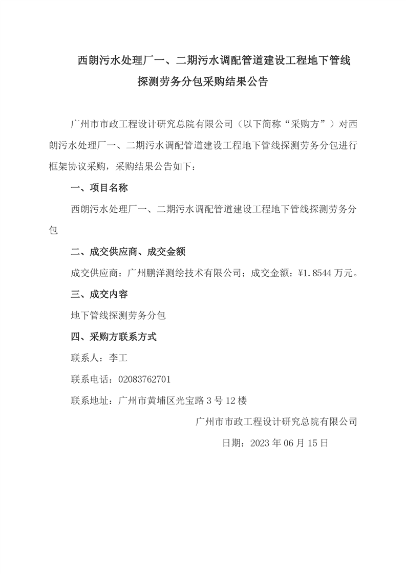 西朗污水处理厂一、二期污水调配管道建设工程地下管线探测劳务分包采购结果公告