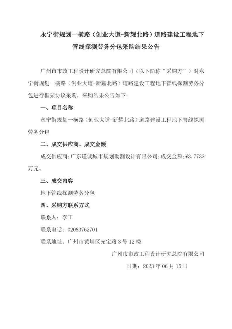 永宁街规划一横路(创业大道-新耀北路)道路建设工程地下管线探测劳务分包采购结果公告