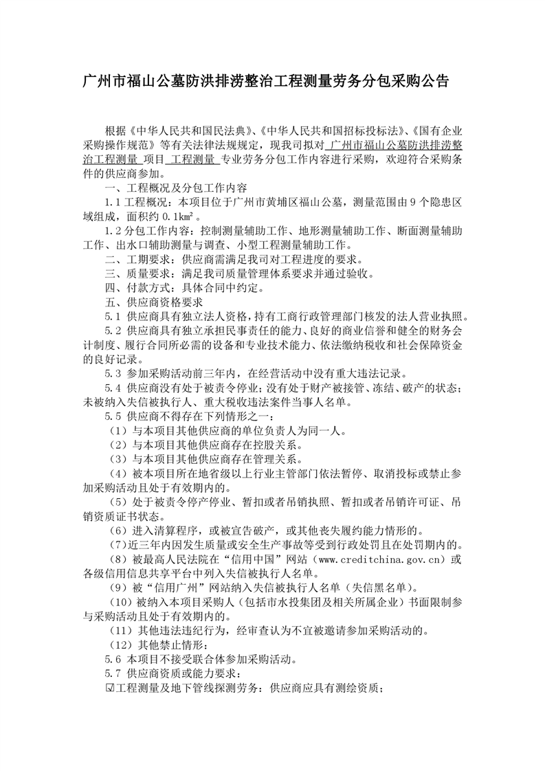 采购公告发布-广州市福山公墓防洪排涝整治工程测量劳务分包