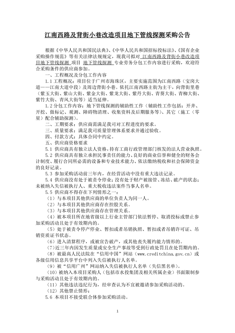 采购公告发布-江南西路及背街小巷改造项目地下管线探测
