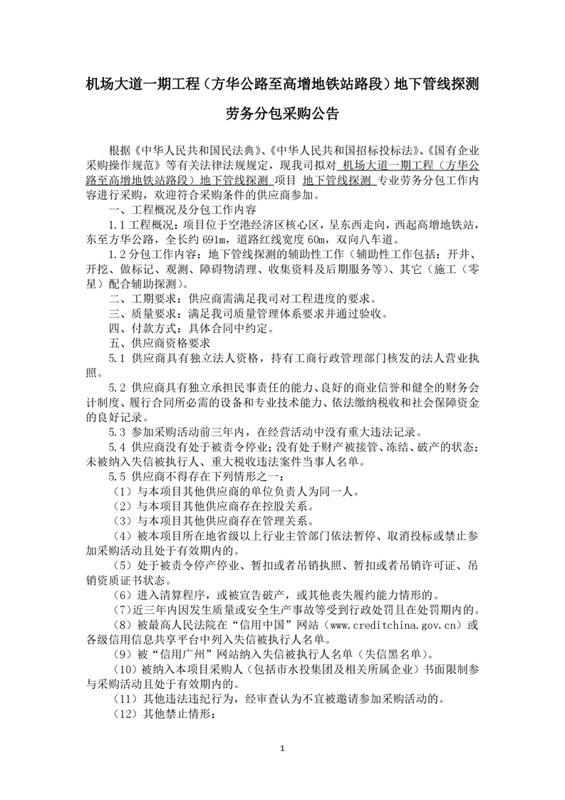 采购公告发布-机场大道一期工程(方华公路至高增地铁站路段)地下管线探测劳务分包