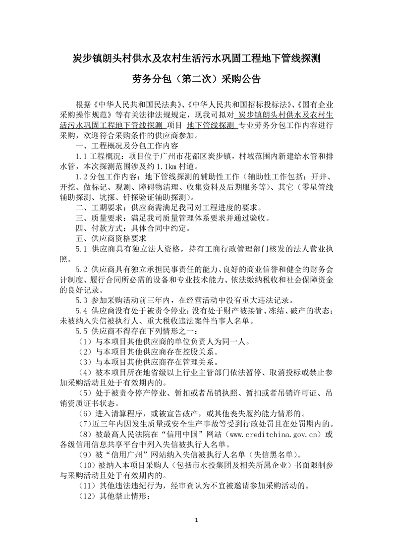 采购公告发布-炭步镇朗头村供水及农村生活污水巩固工程地下管线探测劳务分包(第二次)