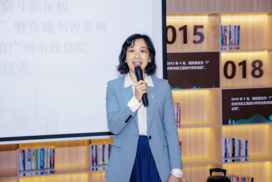 黎婉翎首先对匠心书苑的启用表示祝贺。她表示各职工创新工作室的专业分享让人耳目一新,作为广东省十大书香企业的水投集团,要继续带领好12个职工书屋的创建工作,发挥出“玫瑰书香”“悦读圆梦”“水善心悦”读书品牌的魅力;作为广州市首批提升职工生活品质试点单位的广州市政总院,要继续发挥好职工创新工作服务平台,将匠心书苑打造成职工素质提升的重要窗口。要与黄埔图书馆有机融合,让读书增长知识、提升格局、打开胸襟的作用辐射到职工及职工家庭,让更多的市民打开书、亲近书、爱上书,在读书中丰润人生。探索“书香+琴韵”“书香+书画”“书香+数字化”“书香+创新”等创新模式,让书香走进百千万工程,走进绿美广州、美丽中国建设。